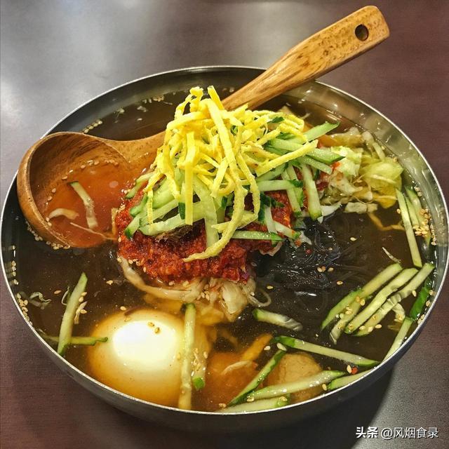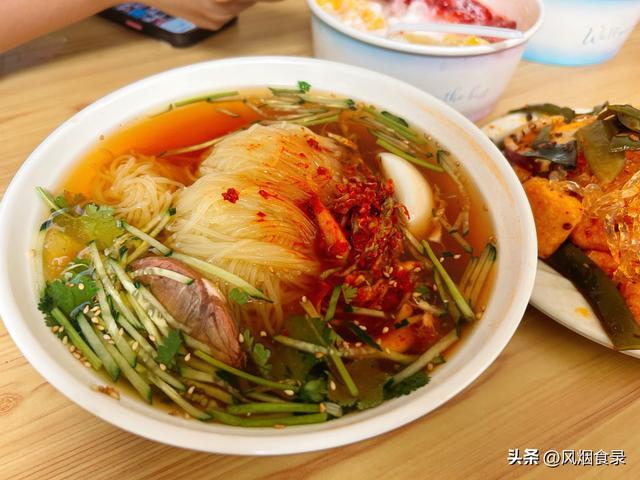 延边冷面是夏日的“救命稻草”,荞麦面过冰水,配上牛肉汤、辣白菜和梨片,酸辣透心凉,一口下去,那叫一个“爽利”。